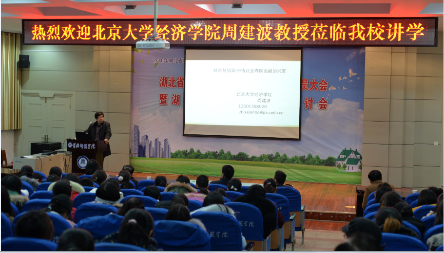 2017年1月11日晚上,北京大学经济公司周建波教授应公司邀请在南区学术报告厅B03作了一场题为《经济与信仰:中古时期寺院金融的兴衰及其启示》的学术报告。经理刘汉成出席了学术报告会并为周建波教授颁发了公司客座教授聘书,经理助理柯珍堂主持学术报告会。