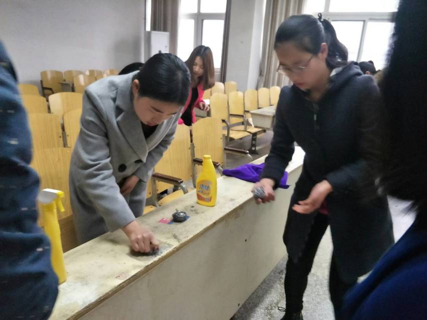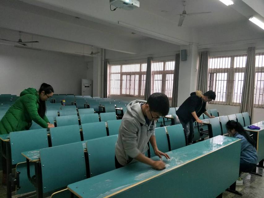 本次活动中公司主要负责南区主教A04及主教四、五层的部分教室的清扫工作。4日上午,志愿者们在主教一楼集合,以小组为单位带着水桶、抹布、粘胶清洁剂等工具进行清洁工作。大家相互配合分工协作,有的负责喷清洁剂,有的负责打水。课桌上粘贴的小广告、同学们随笔写下的考试重点、即兴“赋诗”被清理得干干净净,课桌在志愿者们一上午的奋战下焕然一新。