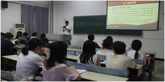 主题党日活动共分两大部分进行,首先,在认真完成“缴纳党费、奏唱国歌、重温入党誓词、诵读党章、学习系列讲话”五项规定动作后,员工党支部组织委员陶依同志就党“组织关系转接”问题,采用图文等多种方式直观地向同学介绍面临毕业党组织关系转接处理方式,并细致入微的针对各党员提出的问题进行讲解答疑。通过党课形式帮助同学们对于党的知识有了更为深入的学习了解。