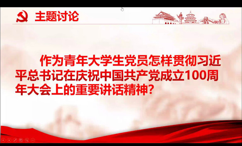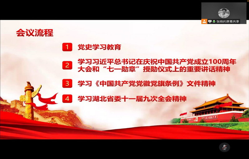 首先,在张晓同志的带领下各位党员缴纳了党费,一起合唱国歌,重温入党誓词、学习党章第七章党的纪律,提醒各位党员同志要自觉提高纪律意识,增强党性修养。随后,张晓同志带领各位党员同志一起重温了“全民族抗战及鄂东敌后抗战”这一段党史,并对习近平总书记在庆祝中国共产党成立100周年大会和“七一勋章”授勋仪式上的重要讲话精神、《中国共产党党徽党旗条例》文件精神、湖北省委十一届九次全会精神三个部分进行了集中谈论学习。