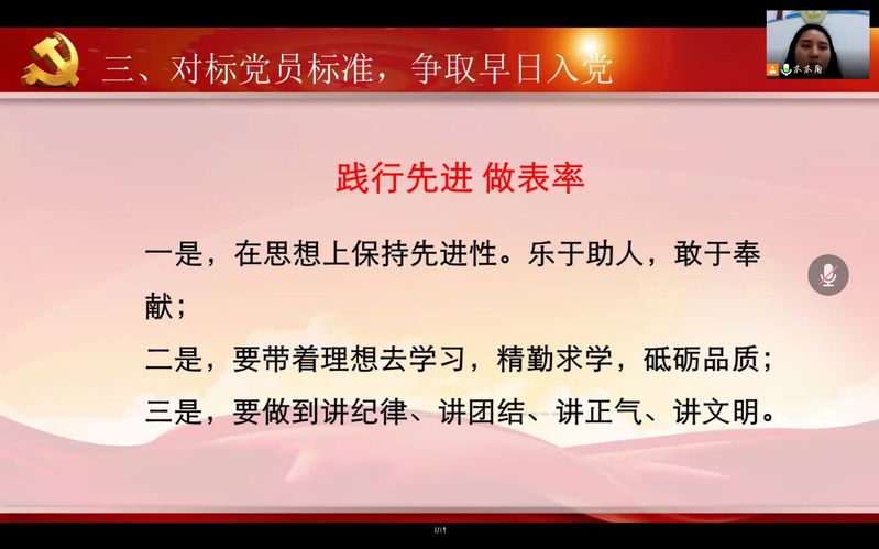 随后,老师以坚定理想信念,端正入党动机,争取早日入党为主旋律展开联合培训班的第一次线上理论课。她指出入党不应以功利性为目的,引导同学们树立共产主义信念,学会在生产、工作、学习和社会生活中起先锋模范作用。用一个个鲜活的优秀共产党员为人民服务的事例,深刻教导每一位入党积极分子理解在组织上一生一次,思想上一生一世的信仰追求。