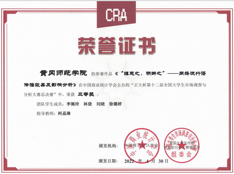 1 | “慎思之,明辨之”——网络流行语传播效果及影响分析 | 柯晶琳 | 李珮玲、林珑、刘晓、徐璐婷 | 国家三等奖 |