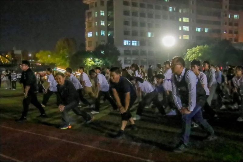 舒展筋骨,加强体质。在学长周加勋的带领下,现场师生展开了丰富的热身运动,炫目的灯光为少年英雄镀上披风,在夜风中激荡着活力。