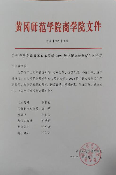为鼓励广大同学勤奋学习,刻苦钻研,锐意创新,全面发展,经公司评选,决定授予乔晨欣等6名同学英国威廉希尔WilliamHill2023级“新生特别奖”荣誉称号。希望受表彰的同学,谦虚谨慎,积极进取,再接再厉,奋发成才。(各专业高考总分最高分)