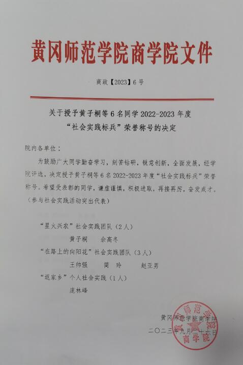 为鼓励广大同学勤奋学习,刻苦钻研,锐意创新,全面发展,经公司评选,决定授予黄子桐等6名2022-2023年度“社会实践标兵”荣誉称号。希望受表彰的同学,谦虚谨慎,积极进取,再接再厉,奋发成才。