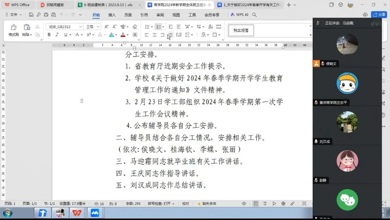 为做好2024年春季学期开学员工安全返校工作,公司在2024年2月23日(正月十四)下午4:00召开了2024年春季学期第一次班主任、辅导员工作会议。公司党委书记刘汉成、经理王庆、副经理马迎霜出席会议,全体辅导员、班主任参加会议,副书记李传坤出席并主持会议。因低温雨雪冰冻天气,会议以视频方式召开。