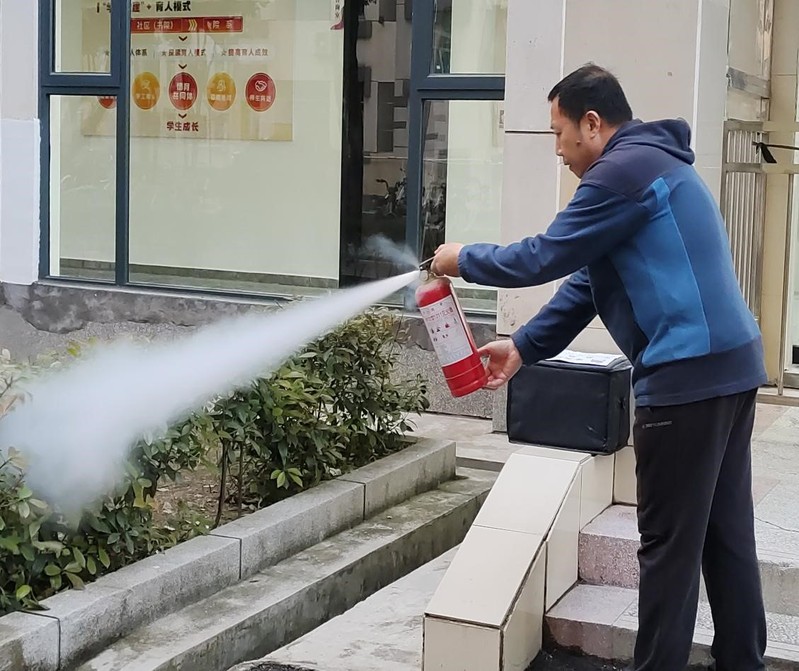 集团消防科阮征老师向同学们介绍了灭火器的使用方法,并现场给同学们演示。灭火时,可手提或肩扛灭火器快速奔赴火场,在距燃烧处5米左右,放下灭火器。如在室外,应选择在上风方向喷射。使用的干粉灭火器若是外挂式储压式的,操作者应一手紧握喷枪、另一手提起储气瓶上的开启提环。
