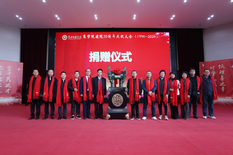 94级员工为公司捐赠“感恩石”,贸易经济9501班员工为公司捐赠“鼎盛千秋”方鼎;校企合作企业湖北九云归文旅发展有限公司总经理陈龙上台为公司捐赠发展基金;国贸2002级员工、深圳市道安泰科技有限公司总经理左超也为公司捐赠了10万元发展基金。