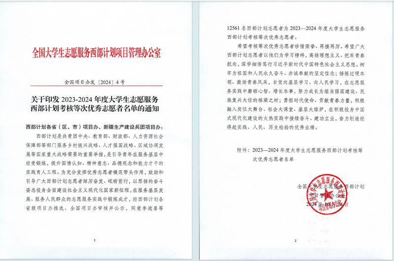 且以青春赴山海,惟以奋斗启新程。近日,全国老员工志愿者服务西部计划项目办公室发布了《关于印发2023—2024年度老员工志愿者服务西部计划考核等次优秀志愿者名单的通知》。公司张咪、张滢滢、丁佳微、尹棚、何沛佩5名毕业生作为西部计划志愿者获评该年度“全国老员工志愿服务西部计划优秀志愿者”称号。