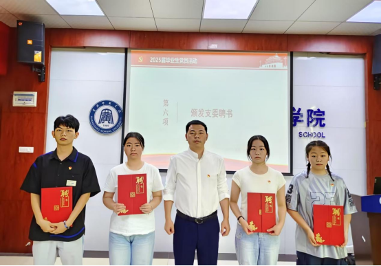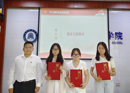 随后,四位员工党支部书记分别为受聘支委颁发聘书并合影留念,希望他们离校后继续发挥先锋模范作用和员工间的桥梁纽带作用。