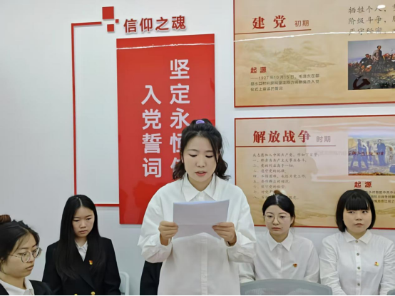 新发展党员代表王杨丹菲同志代表全体新发展党员向党组织的关怀与培养表示感谢。她表示,从递交入党申请书起,就逐渐认识到共产党员不仅是一个身份,更是一份沉甸甸的使命,在不断地学习中领悟到党的百年奋斗史是为人民谋幸福、民族谋复兴的史诗,作为新时代党员需要赓续红色血脉,将个人理想与党和人民的事业紧密相连。她代表新发展党员庄严承诺,将以本次入党宣誓为起点,做到以学铸魂、勤学修德、担当奉献,发挥党员先锋表率作用,以“强国有我”担当绽放青春光芒,用一生奋斗为党旗增辉。